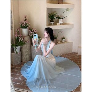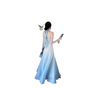 十三行好质量法式时尚绣花收腰蓝色渐变系带挂脖连衣裙女2025夏季