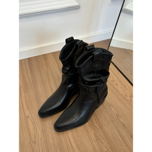 牛皮版~真皮内增高8cm尖头粗跟短靴女显瘦堆堆靴西部牛仔靴马丁靴