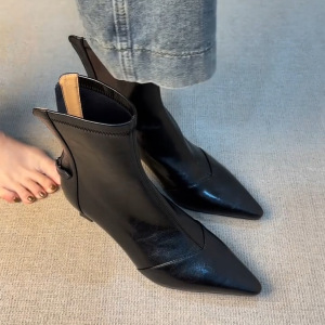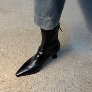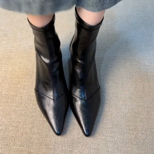 牛皮版~尖头高跟气质小短靴女法式弹力瘦瘦靴百搭显瘦马丁靴
