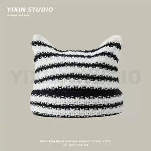 秋冬可爱猫咪耳朵毛线帽女日系条纹保暖针织帽情侣百搭尖尖套头帽