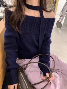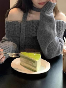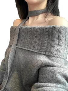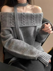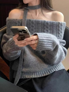 一字肩毛衣女韩系灰色秋冬时尚感百搭宽松外穿慵懒风漂亮针织上衣