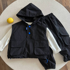 男童春款套装2025新款洋气男宝宝连帽马甲打底衫工装长裤三件套潮