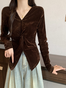 2025新款秋季咖色丝绒衬衫大码女装胖MM收腰遮肚V领长袖上衣