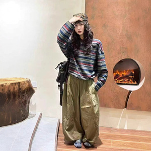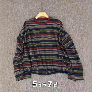 新品日系宽松圆领套头百搭显瘦小衫条纹拼色T恤