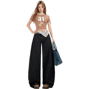 黑金色低腰弯刀牛仔裤女2025秋季新款宽松阔腿裤小众设计感香蕉裤
