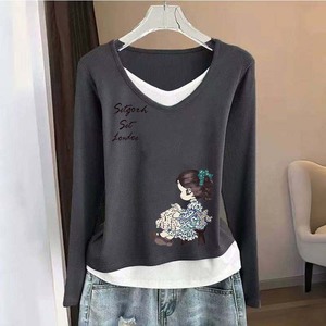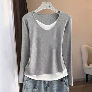 欧货纯棉假两件V领修身显瘦长袖t恤女2025宽松大码洋气上衣打底衫