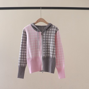 秋冬新款学院风格子拼色连帽拉链长袖针织开衫毛衣外套收腰