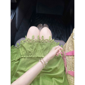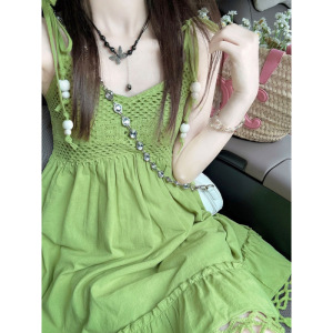 森系清新绿色流苏吊带连衣裙夏季新款波西米亚风设计感度假裙子女