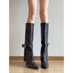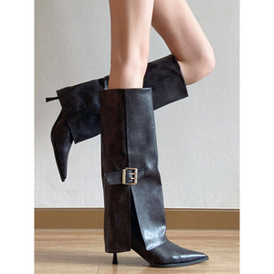 尖头骑士靴女皮带扣高跟裤管靴2025秋冬新款细跟高筒靴显瘦长靴子