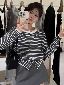 25秋冬新款双股羊毛女双拼条纹开衫针织衫正肩毛衣上衣长袖高级感