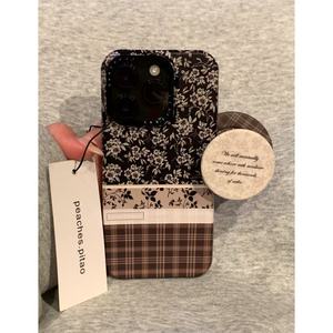 复古黑底碎花拼接棕格纹磁吸支架适用iPhone16promax苹果15手机壳