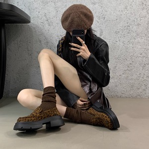 2025秋季新款增高粗跟厚底小个子小皮鞋乐福鞋女中跟豹纹单鞋圆头