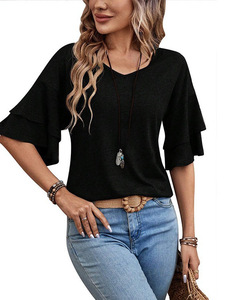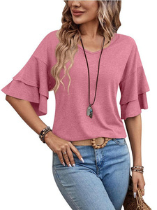 亚马逊2025 欧美跨境外贸夏季新款纯色V领双层袖宽松T恤短袖女式