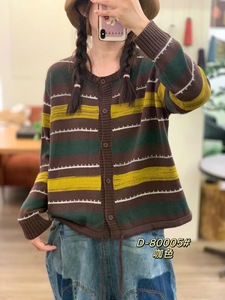 撞色针织开衫女 2025秋新款复古文艺宽松圆领条纹毛衣外套 80005