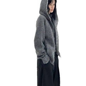灰色双拉链针织开衫拼接格纹连帽毛衣外套男女秋冬季慵懒宽松均码