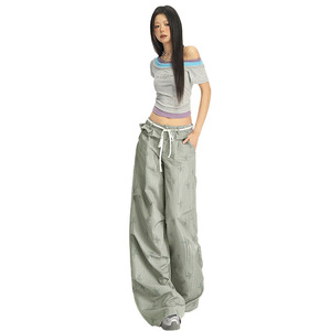 【今茵】休闲条纹星星速干裤女花边拼接设计感伞兵裤宽松慵懒阔腿