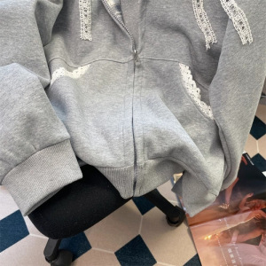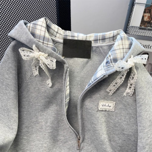 美式复古格子蕾丝连帽卫衣女春秋新款oversize宽松学院风开衫外套