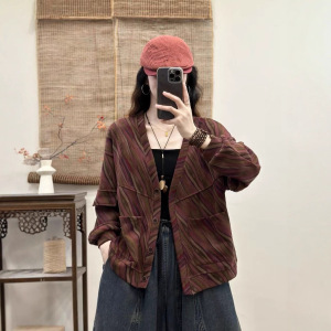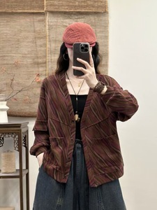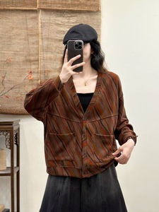 印花开衫女 2025秋新款复古文艺宽松V领双口袋卫衣外套上衣 9218