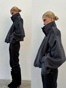 跨境欧美秋冬系扣立领短款毛呢外套女复古时尚拉链宽松慵懒风夹克