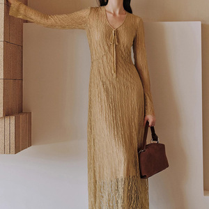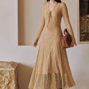 爱丽丝~镂空蕾丝轻薄V领系带长款收腰显瘦法式连衣裙女秋2025新款