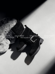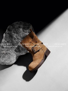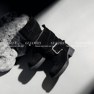 欧洲站女鞋25秋经典款时尚皮带扣软牛猄皮圆头轻厚底款套筒低筒靴