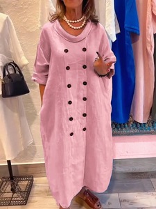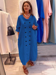 2025新款欧美跨境女装宽松纯色度假休闲纽扣文艺风时尚棉麻连衣裙