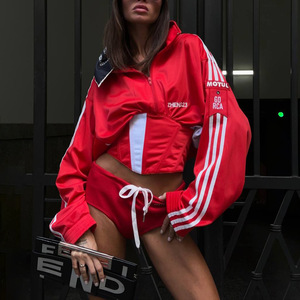 欧美辣妹时尚贴布短款收腰紧身夹克女连帽拉链长袖外套字母撞色