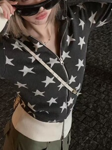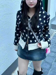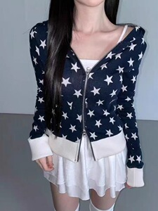 美式星星提花连帽针织开衫女秋季ins小众设计感修身显瘦拉链外套