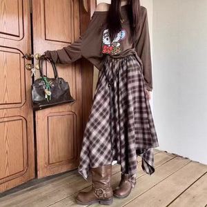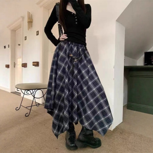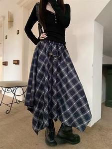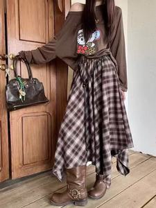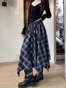 时尚复古格纹不规则半身裙女2025秋季新款系带高腰褶皱大摆裙ins