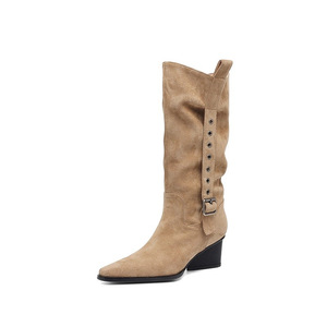 牛皮版复古褶皱皮带扣中筒靴堆堆靴秋冬粗跟西部牛仔靴尖头高跟靴