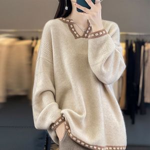 韩版宽松慵懒风毛衣打底衫2025秋冬撞色V领针织衫女洋气外穿上衣