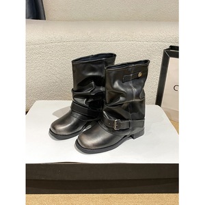现货秒发~西部牛仔堆堆靴女2025新款褶皱裤管短靴擦色复古骑士靴