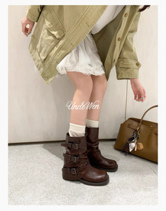 月屿皮质美拉德中筒马丁靴女复古英伦内增高粗跟褶皱堆堆裤管短靴