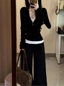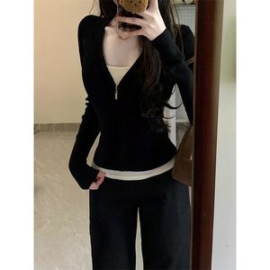 辣妹黑色假两件长袖恤女春秋新款复古设计修身显瘦拉链打底上衣