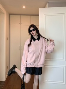 甜美风粉色翻领休闲夹克上衣女早秋小众设计感宽松美式棒球服外套