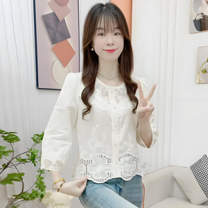 时髦洋气刺绣衬衫女蕾丝拼接圆领上衣秋季爆款气质外贸七分袖小衫