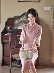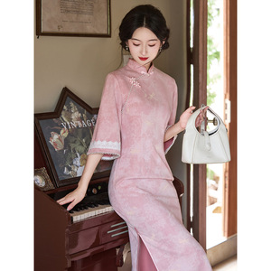 长袖旗袍女新中式2025新款粉色连衣裙秋冬复古气质高端绝美麂皮绒