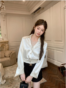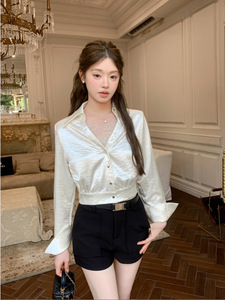 法式气质V领缎面蕾丝拼接长袖短款上衣衬衫+百搭短裤初秋套装女