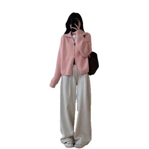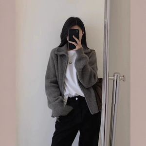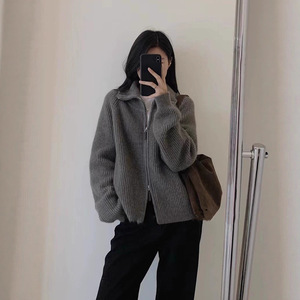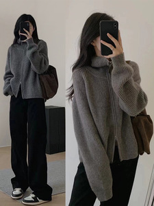 灰色浣熊绒半高领立领双拉链毛衣外套女秋冬加厚外搭外穿针织开衫