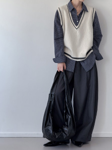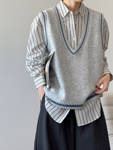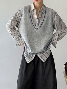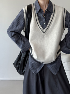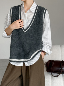 橘芷 早秋 新款学院女孩复古风格宽松大V领撞色针织背心马甲 5849