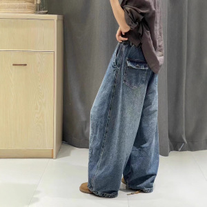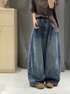 复古水洗牛仔阔腿裤女 2025秋新款松紧腰文艺宽松大码长裤 51285
