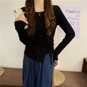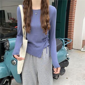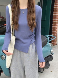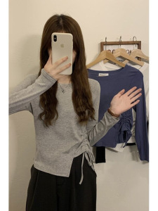 正肩长袖t恤女春秋内搭短款小个子显高别致设计感抽绳打底衫上衣