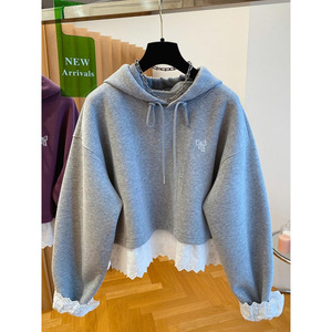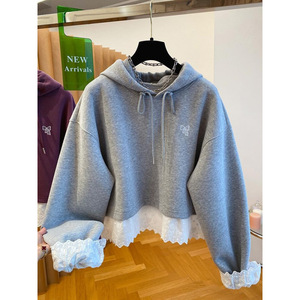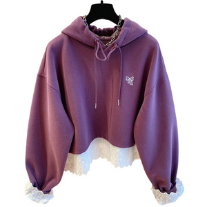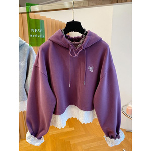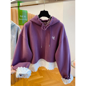 超好看下摆蕾丝花边拼接紫色卫衣女2025新款宽松减龄假两件上衣秋