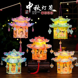 中秋节灯笼国潮手提古风花灯儿童手工diy材料包pvc发光投影小宫灯