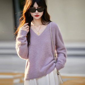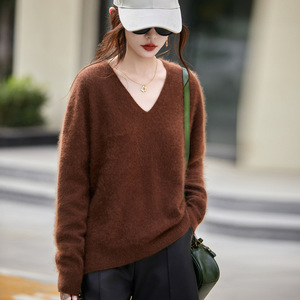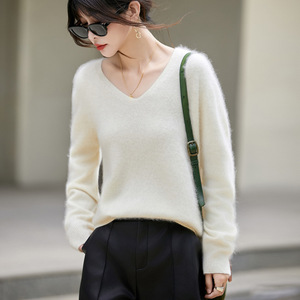 无缝一体女式针织毛衣V字领套头打底衫拉毛工艺经典纯色内搭上衣