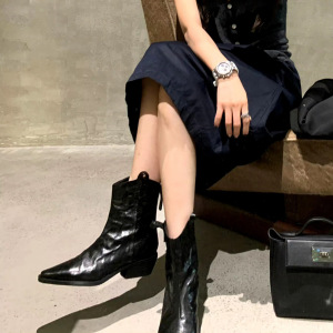 牛皮版~时髦尖头V口显瘦粗跟皱感西部短靴女真皮马丁靴单靴小踝靴