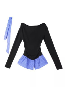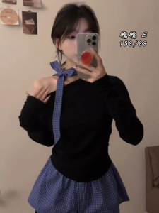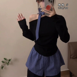 假两件格子拼接露肩长袖t恤女秋冬设计感小众独特别致甜辣妹上衣