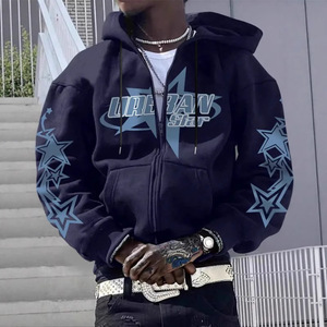 街头Y2K星星和字母印花落肩保暖拉链连帽衫日常假日秋季潮牌男装