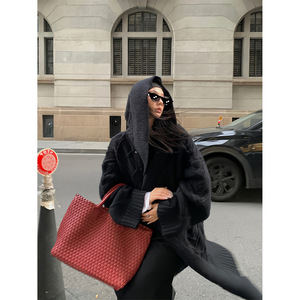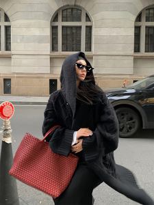 区区欧阳绞花连帽毛衣外套女冬季加厚宽松过膝中长款针织开衫大衣