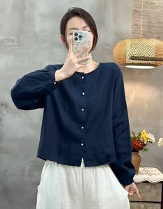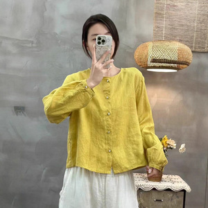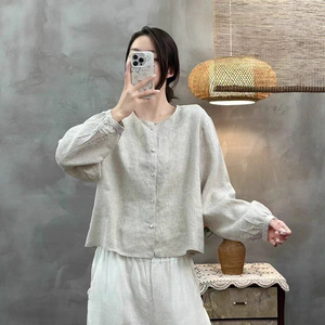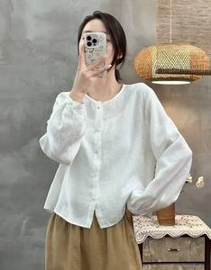 复古文艺纯亚麻长袖圆领衬衫2025年秋季新款宽松休闲时尚女式衬衣
